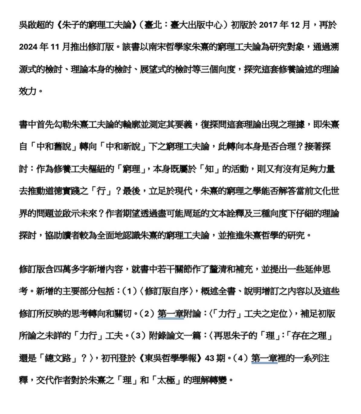 中國哲學研究中心將於11月22日(六)下午2:00假鵝湖人文書院(新北市中和區中正路797號3樓之2)舉辦「《朱子的窮理工夫論》(修訂版)新書發表會」,邀請該書作者、國立政治大學哲學系吳啟超助理教授擔任主講人,中央研究院中國文哲研究所呂政倚助研究員擔任與談人,國立中正大學中國文學系暨研究所陳佳銘教授主持。謹附活動海報及該書簡介。活動將同步以視訊進行,視訊連結、報名網址如下,也可掃描海報中的QR code進入視訊連結和報名網址: